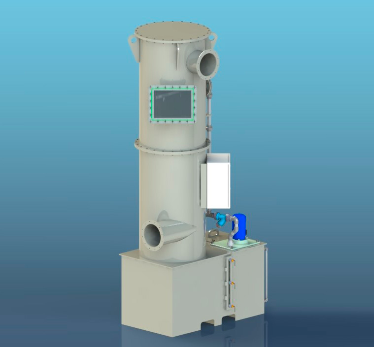 Скруббер состоит из бака с раствором, цилиндрической колонны с насадкой (кольцами Палля), насоса подачи раствора на форсунки, коллектора с форсунками, распределяющими раствор по насадке.