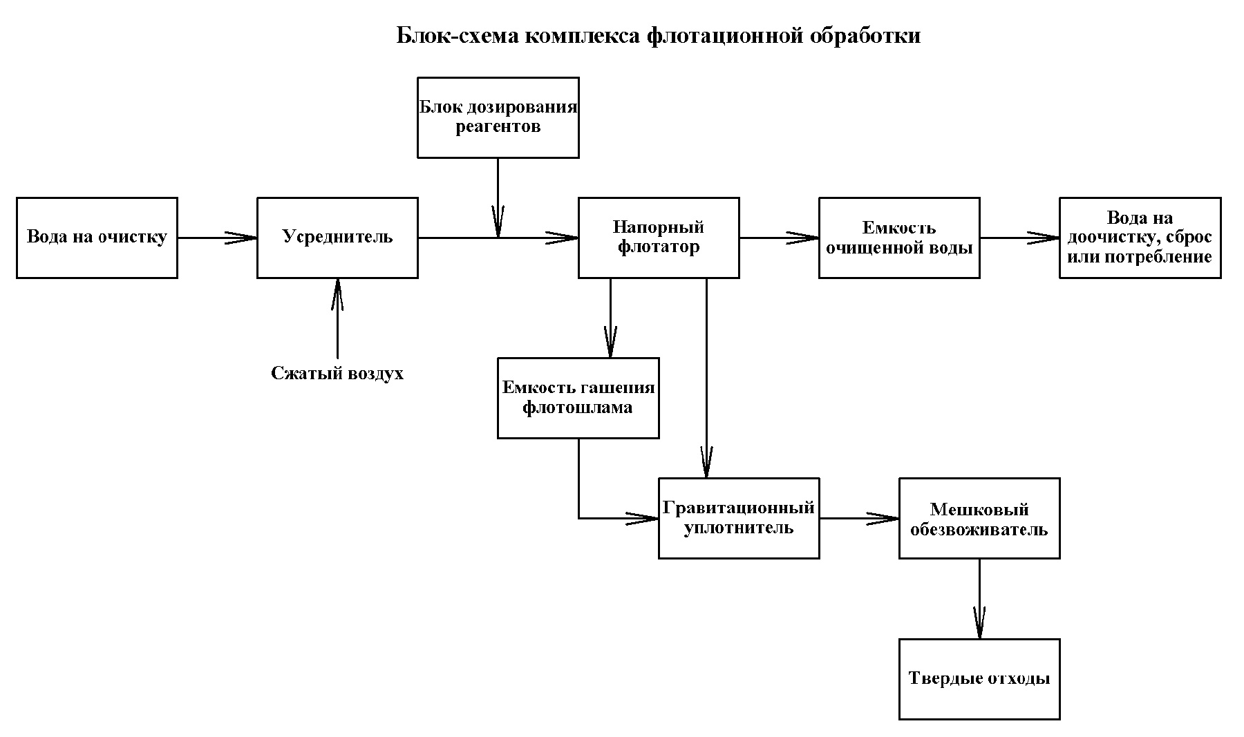 Сточные воды поступают в усреднитель, объем и конструкция которой обеспечивает сглаживание неравномерности поступления и усреднение состава подаваемого сырья, что гарантирует равномерность нагрузки и стабильность работы флотатора.