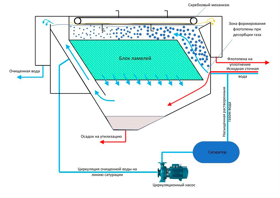 В момент выхода полученной гетерогенной системы в чашу флотатора за счет падения давления происходит «вскипание» — резкое выделение растворенных газов. Мелкие пузырьки растворенных газов, выделяются на поверхности флокул и образуют флото-комплексы, обладающие положительной плавучестью, что способствует их всплытию на поверхность, откуда они удаляются скребковым механизмом, очищающим зеркало флотатора. Частицы с отрицательной плавучестью оседают в придонную зону осадконакопления. Таким образом в чаше флотатора происходит извлечение широкого спектра примесей с образованием двух видом отходов: осадков (твердые частицы+ вода до 99,9%) и флотошлама (твердые частицы, вода и воздух).
